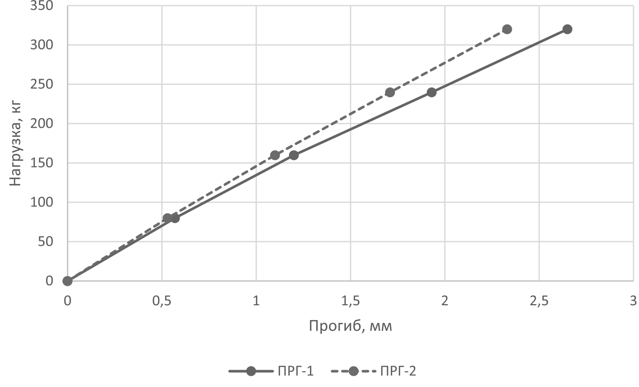 Прогиб конструкций возрастал пропорционально прикладываемой нагрузке. Максимальная величина прогиба деревянного перекрытия составила 2,34 мм для испытания №1 и 2,3 мм для испытания № 2, максимальный прогиб железобетонной балки составил 2,66 мм для испытания №1 и 3,28 мм для испытания № 2. Показания прогибомеров не свидетельствовали о наличии пластических деформаций. Предельно допустимые значения прогибов значительно превышают фактические величины. Максимальная ширина раскрытия нормальных трещин в конструкциях на последнем этапе нагружения не превышала 0,05 мм. После выдержки конструкций под нагрузкой в течение трех суток показания прогибомеров зафиксировались на одном значении. После снятия нагрузки показания прогибомеров вернулись к первоначальным значениям. Признаков, свидетельствующих о разрушениях конструкций, не зафиксировано.