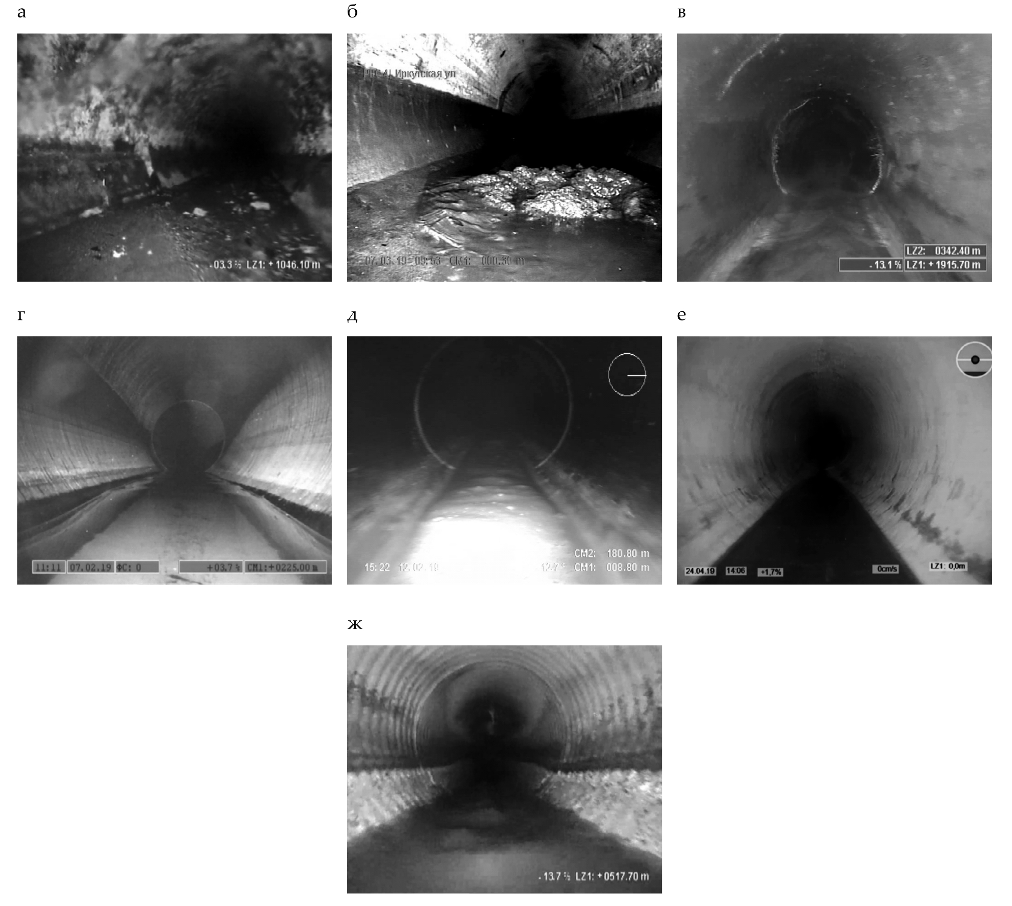 Рис. 2. Фрагменты отложений в лотковой части труб из разного вида материалов: а − трубы из железобетона 700 мм; б − трубы из асбестоцемента 456 мм; в − трубы из керамики 150 мм; г − трубы из полиэтилена 900 мм; д − трубы из поливинилхлорида 200 мм; е − трубы из стеклопластика 500 мм; ж − трубы из полипропилена
