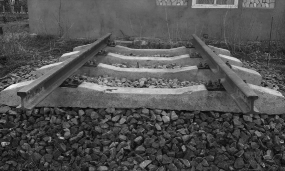 1 этап – на экспериментальном участке железнодорожного пути. Были проведены исследования на чистом экспериментальном участке балластной призмы железнодорожного пути для исключения мешающих условий и случайных загрязнений [1]. Было осуществлено новое строительство экспериментального участка железнодорожного пути с полотном длиной 3,5, шириной 5,5 м согласно нормативным документам и стандартам [9−14]. Для установки были использованы стандартные железнодорожные рельсы марки Р45 [12, 14, 15]. Межшпальное пространство составляло 543 мм согласно [13, 14] (рис. 3, 4).