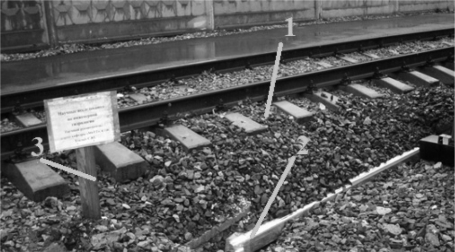 Рис. 5. Экспериментальная установка железнодорожного пути: 1 – исследуемый железнодорожный путь; 2 – технологическая схема отвода поверхностного стока с участка железнодорожного пути; 3 – информационная надпись