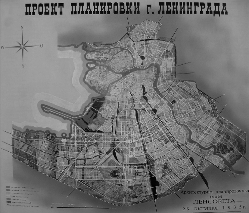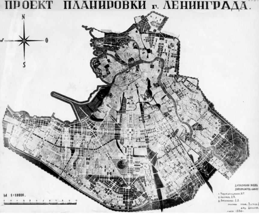 В 1935 г. был объявлен открытый конкурс на эскизный проект планировки Ленинграда. А. И. Наумов вместе со своими однокурсниками А. А. Афонченко, И. В. Мецхваришвили и И. Н. Халиным приняли участие в конкурсе, и их проект был отмечен 1-й премией. В связи с этим им было разрешено взять эту тему в качестве дипломного проекта, и работа была выполнена под руководством проф. В. А. Витмана и доцента В. В. Данилова, работавшего в то время вместе с Л. А. Ильиным (рис. 1).