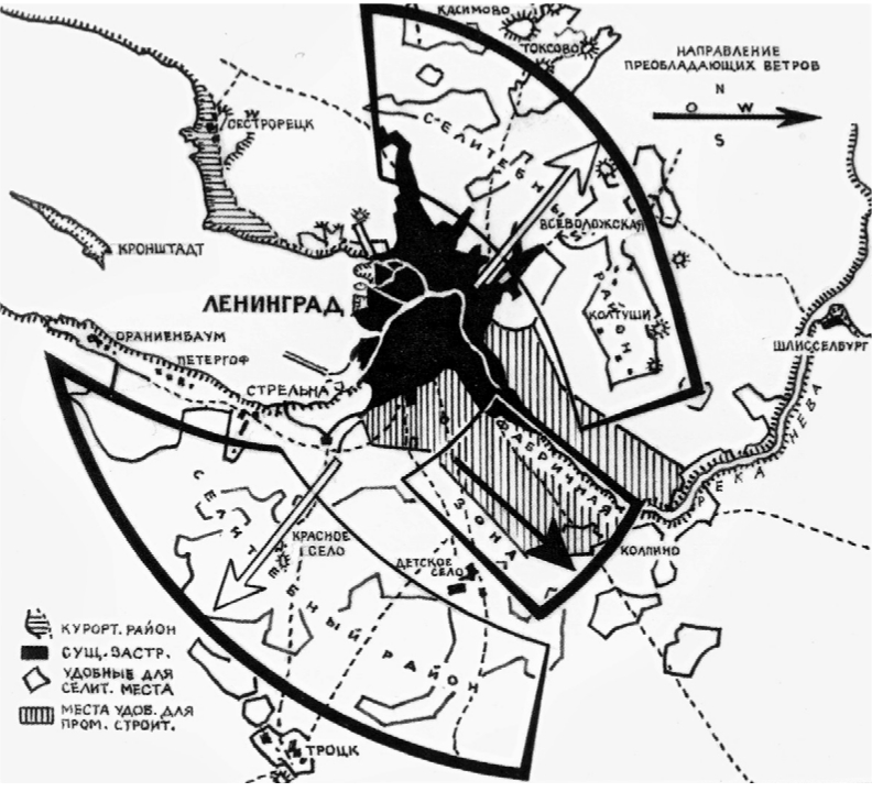 В этой же мастерской, параллельно с ТЭО, под руководством А. И. Наумова разрабатывался генеральный план Пригородной зоны Ленинграда (рис. 10). Пригородная зона (окружающий Ленинград планировочный район) должна была приобрести новые градостроительные качества. Здесь намечалось расселить 800 тыс. чел. и разместить градообразующие объекты (места приложения труда) в предусмотренных к развитию городах-спутниках, чтобы не более 10 % трудящихся ездили на работу в Ленинград [3, с. 12].