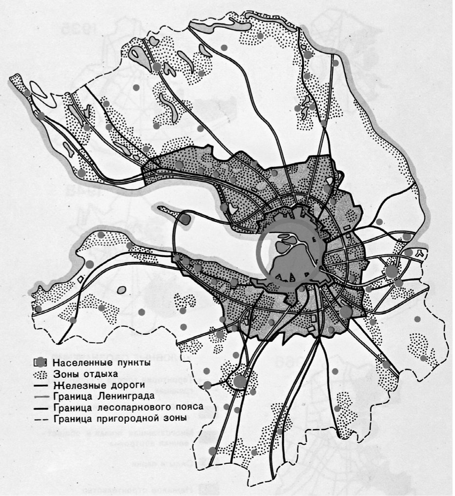 С самого начала этот проект разрабатывался совместно с будущим Генеральным планом развития Ленинграда и рассматривался в качестве логического продолжения архитектурно-планировочной структуры города, чем существенно отличался от прежних разработок, в частности Генерального плана 1948 г. [8, с. 333]. Основная градостроительная идея, заложенная в проекте организации Пригородной зоны, состояла в том, чтобы создать вокруг города мощное природное кольцо, выполнявшее санитарно-гигиенические функции в качестве постоянного источника чистого воздуха, создавало возможности для кратковременного отдыха населения города в естественных природных условиях. Для этих целей проектом отводилась территория в 2600 км2 [8, с. 333]. При этом проект предусматривал полное сохранение существовавших сельскохозяйственных земель в лесопарковом поясе Ленинграда [8, с. 342].