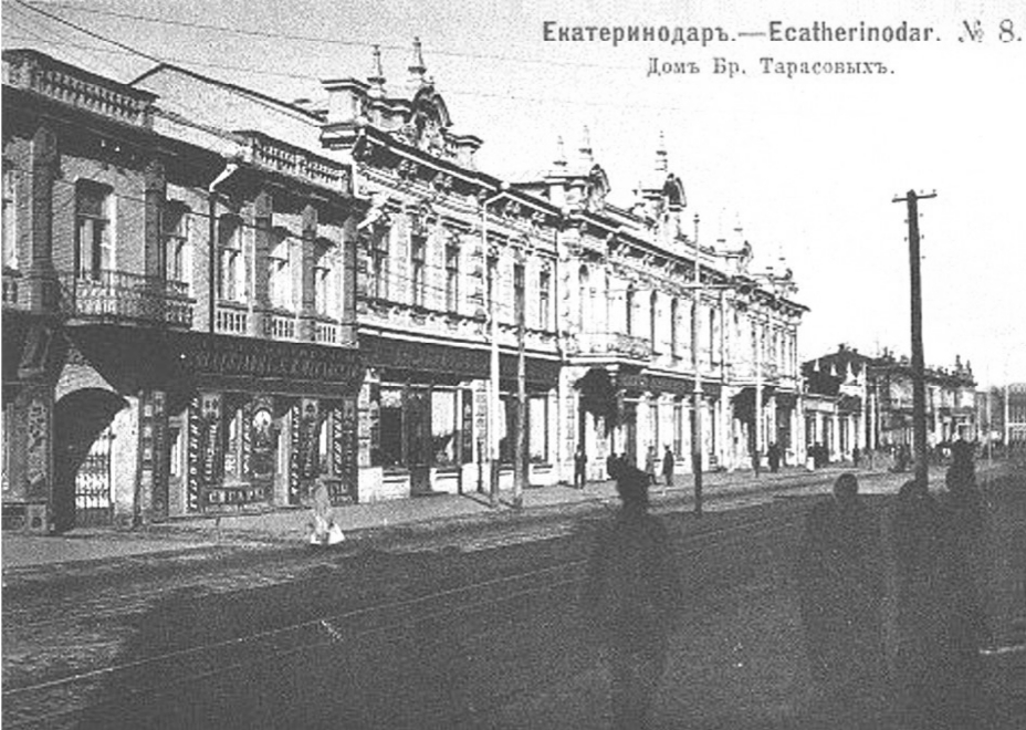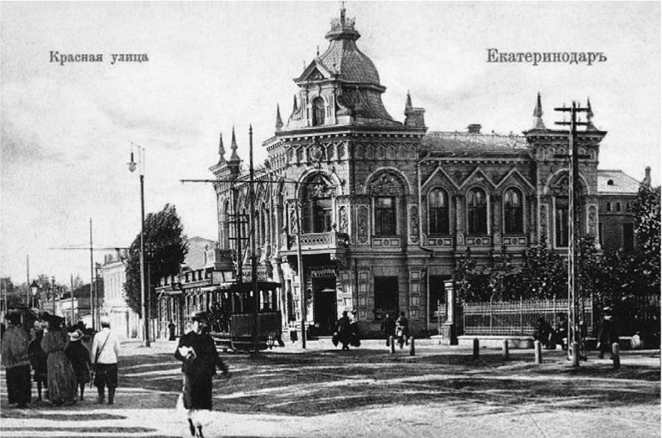 Рис. 4. Екатеринодар. Дом жилой братьев Тарасовых. Ул. Красная. Вид на север от ул. Кирпичной (совр. – ул. Чапаева). 1903 г. [11]. Памятник архитектуры регионального значения