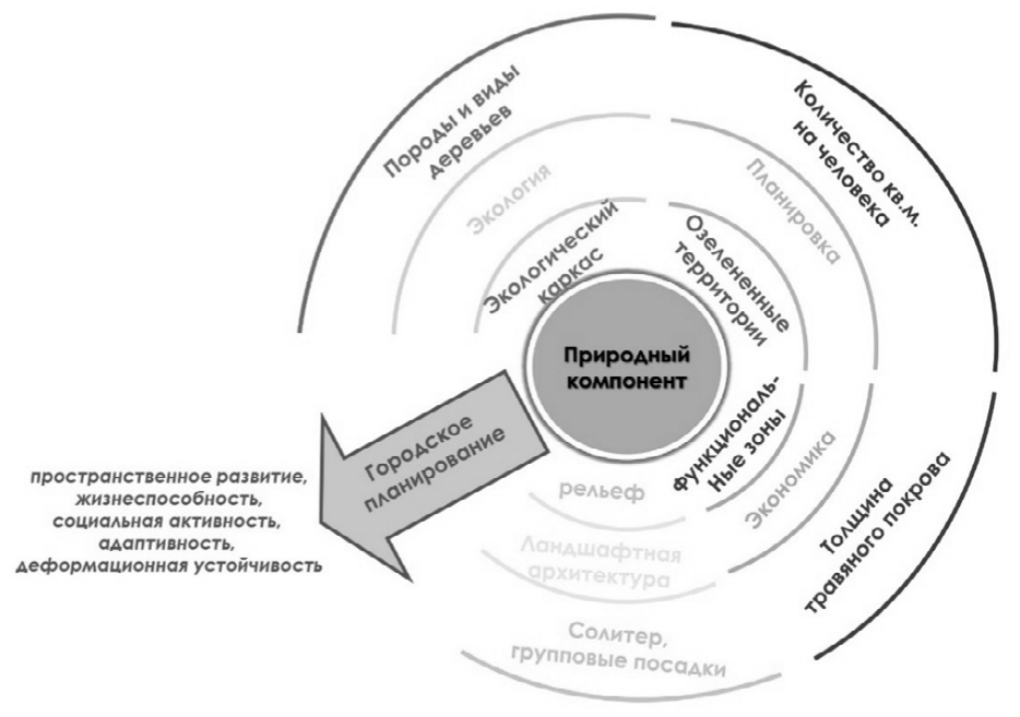 Имеющиеся подходы к осмыслению природных компонентов городской среды представляют собой узкодисциплинарные взгляды, не дающие в полной мере возможность увидеть роль и место этих компонентов с позиции городского планирования; в основном ориентированы на рассмотрение элементов городской растительности как объекта проектного действия или как сопутствующий источник существования антропогенной урбанизированной среды. По меткому замечанию, «стандартные критерии оценки городского пространства, которые применяются в наше время, просто не в силах справиться с такой мультифакторной и тонкой задачей» [16]. Разработка новых подходов и фокус на жизнеспособности обуславливают интерес к специфическим характеристикам адаптивности урба-социо-природной системы.