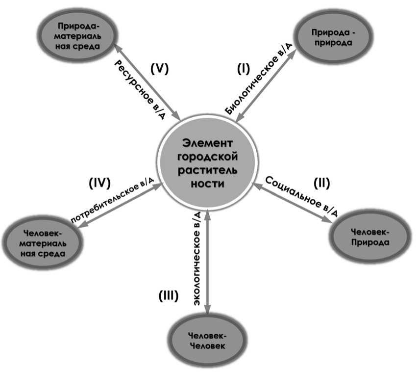 Объединяя эти подходы, можно сделать вывод о возрастании роли вовлеченности элементов городской растительности в различные городские процессы. Вовлеченность определяется в ходе следующих исследовательских действий: 1) оценка включенности зеленых насаждений и растительности в различные обменные процессы и цепочки, которые подразделяются по субъектам взаимодействия (см. рис. 2): «природный компонент – природный компонент»; «человек – природный компонент»; «человек – человек»; «человек – материальная среда», «природный компонент – материальная среда»; 2) устанавливается общая иерархия природных элементов города в зависимости от степени их суммарной «молчаливости» или «активности» в процессах взаимодействия между естественной средой, человеком и техногенной сферой; 3) применимо к конкретной территории может определяться процентное и количественное соотношение структурных элементов городской растительности, принадлежащих различным ступеням иерархии.