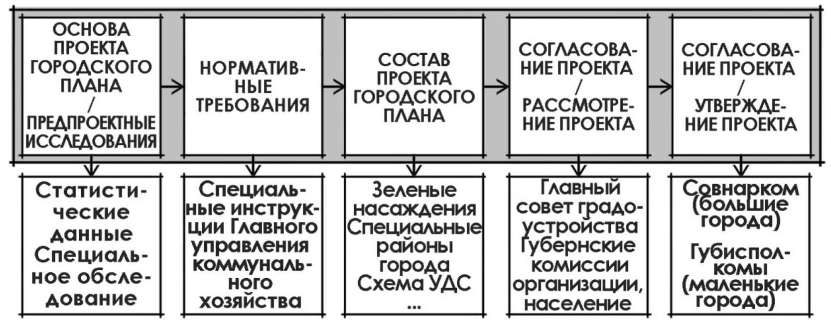 Рис. 1. Методика проектирования и согласования городских планов (составлено авторами по материалам проекта декрета о составлении городских планов, 1922) [6, с. 18–19]