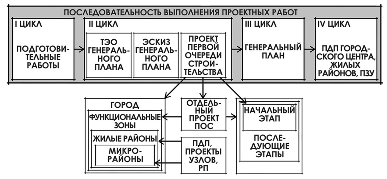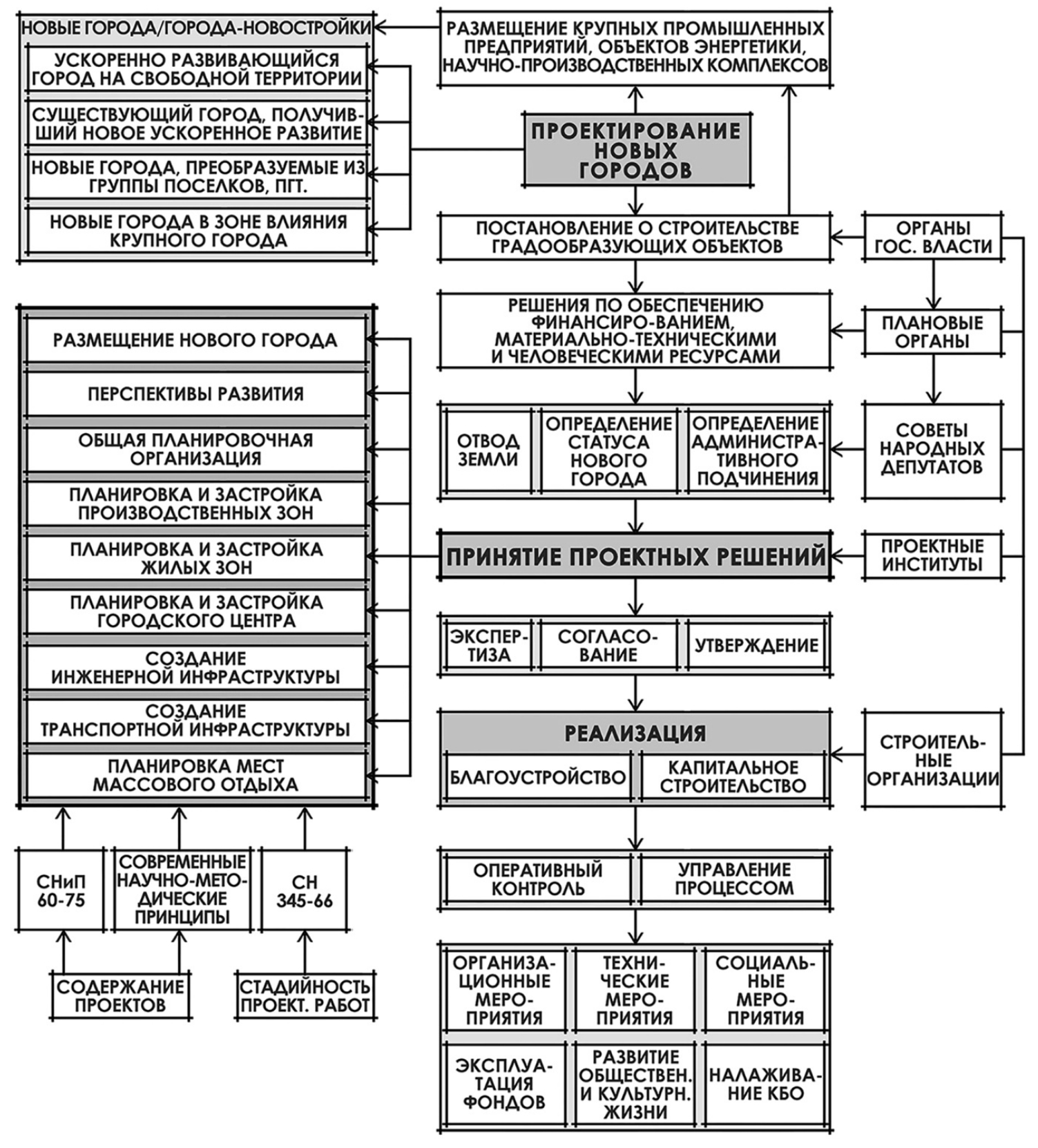 Сводная технологическая схема, описывающая методику проектирования (рис. 6) нового города от уровня системы расселения до этапа реализации проекта на начало 1980-х, выглядела следущим образом.