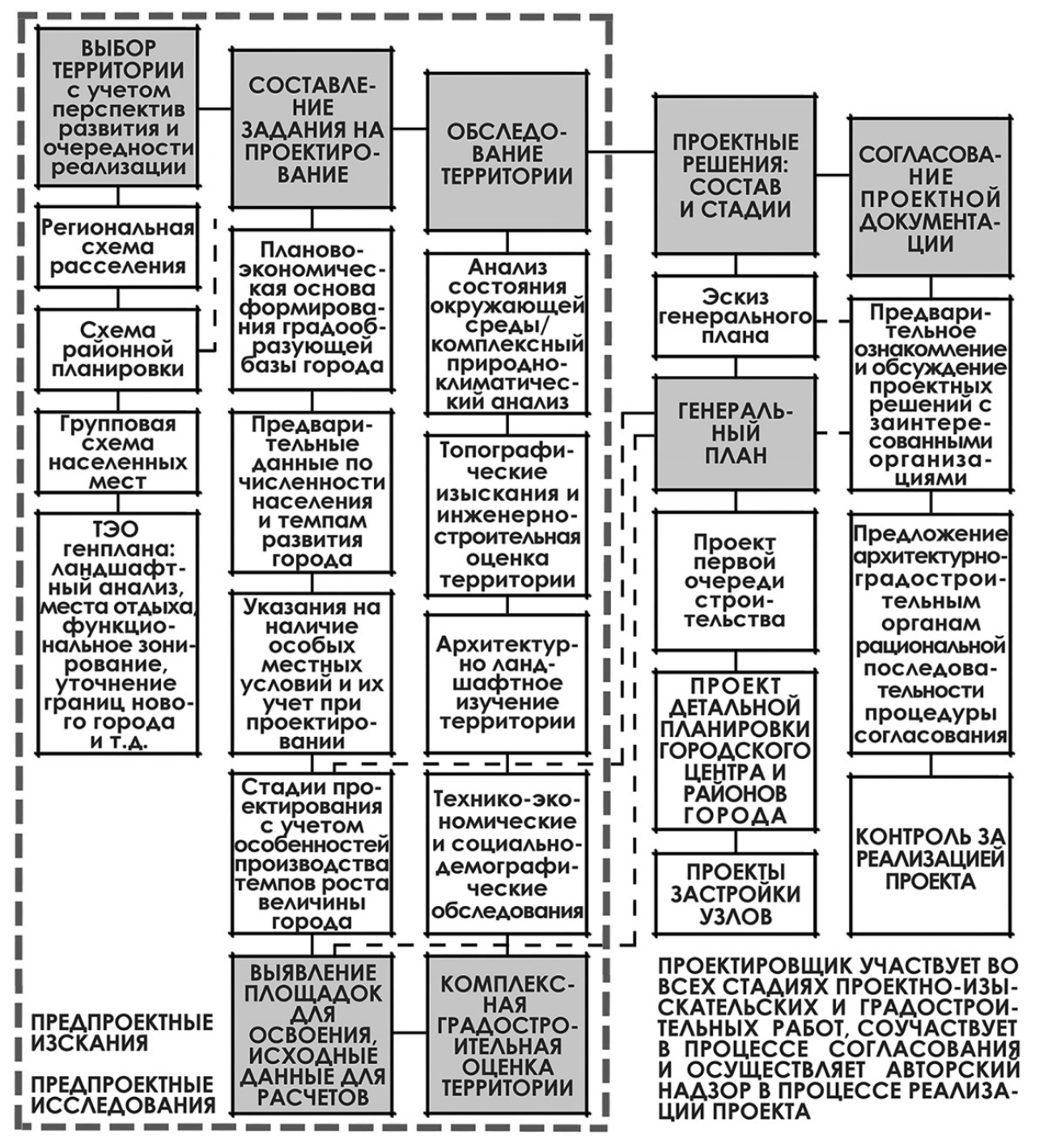 Рис. 6. Технологическая схема подготовки градостроительной документации (составлено авторами по материалам Руководства по проектированию новых городов, 1982 г.) [9]