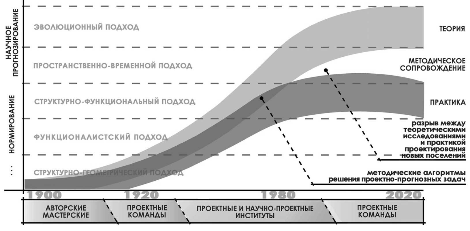 Рис. 11. Логика развития теоретической и прикладной составляющей отечественного градостроительства очевидно характеризуется дефицитом материалов, позволяющих объединять концепции и прикладные проектные действия. Есть потребность в возрождении утраченного института методического сопровождения в градостроительстве (схема авторов)