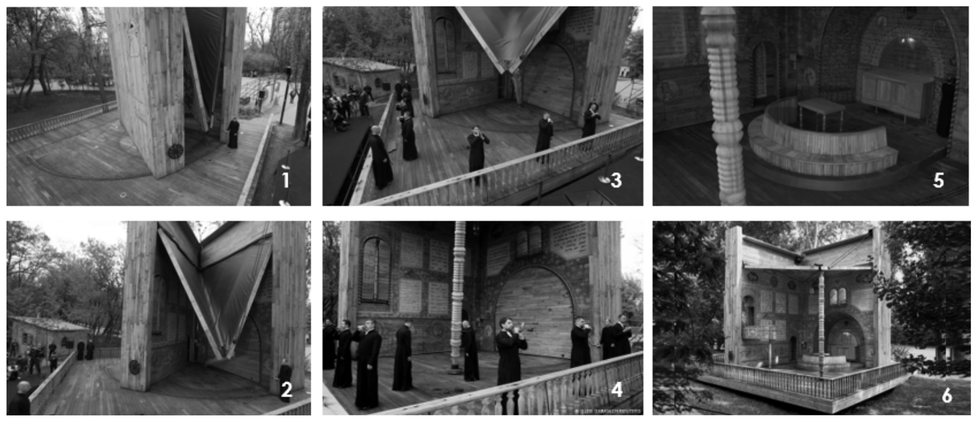 Синагога представляет собой конструкцию книги, способной «открываться» в просторную синагогу и «закрываться» в мемориальный объект. Наряду с признаками кинетической архитектуры (рис. 5, 6) синагога обладает и другими признаками адаптивности. Синагога построена из амбарного дуба, привезенного из разных регионов Украины, и расписана вручную [8]. Внутри синагоги при открывании полукруглой платформы появляется арон-а-кодеш (ковчег для хранения свитка Торы) и бима. Предусмотрен балкон для женщин.