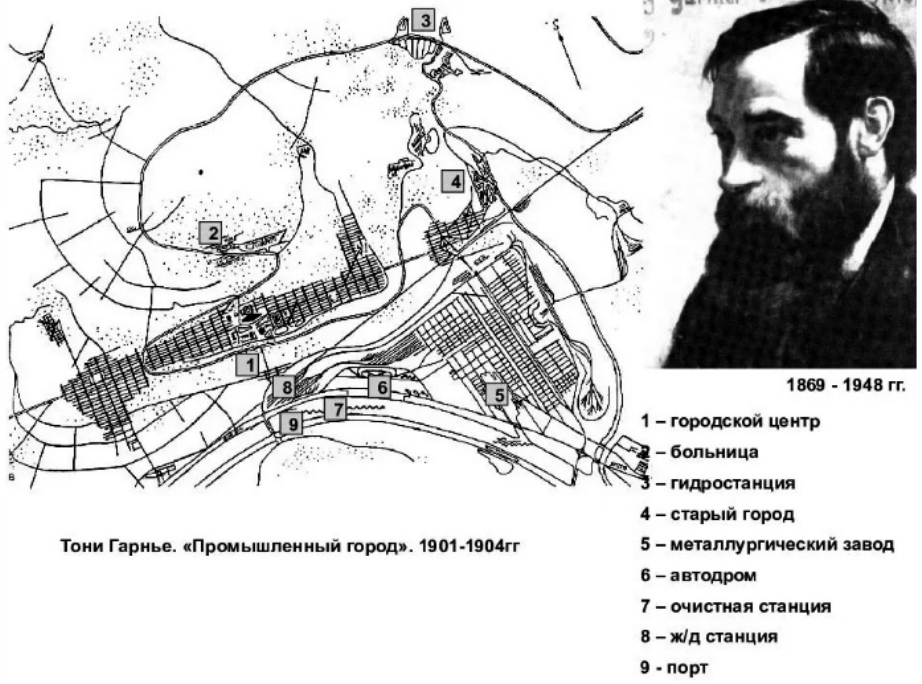 Во Франции предшественником идей Корбюзье был архитектор Тони Гарнье. В 1904 г. он предложил проект «Промышленного города» на 35000 жителей, основанный на разделении по функции всей территории города по функциональному признаку, – один из самых ранних проектов, подчиненных идее зонирования (рис. 1).