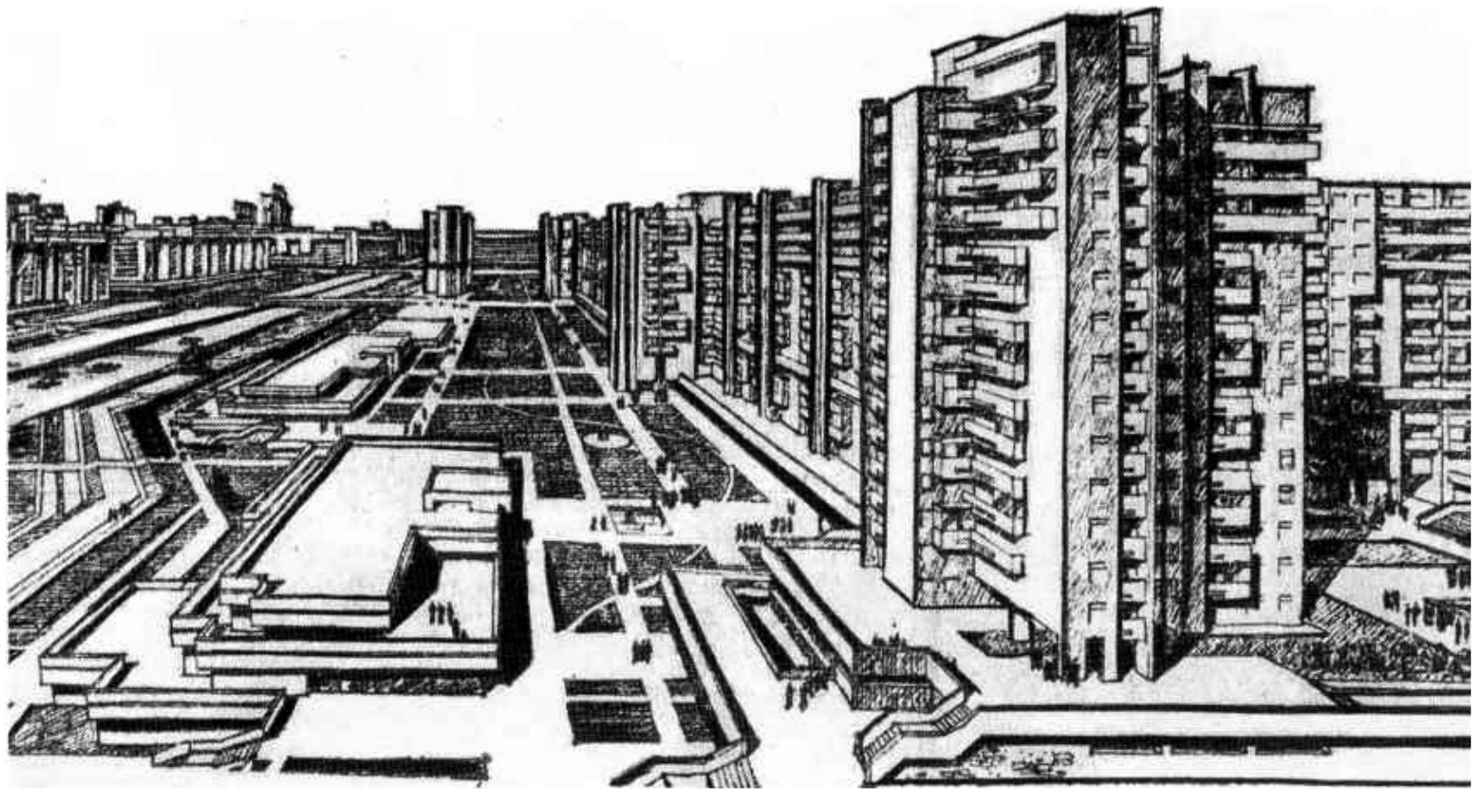 Рис. 4. Проект застройки микрорайона в Новосибирске, 1968. Оптимистичный образ городского пространства, ассоциирующийся с проектом «Лучезарного города» Ле Корбюзье