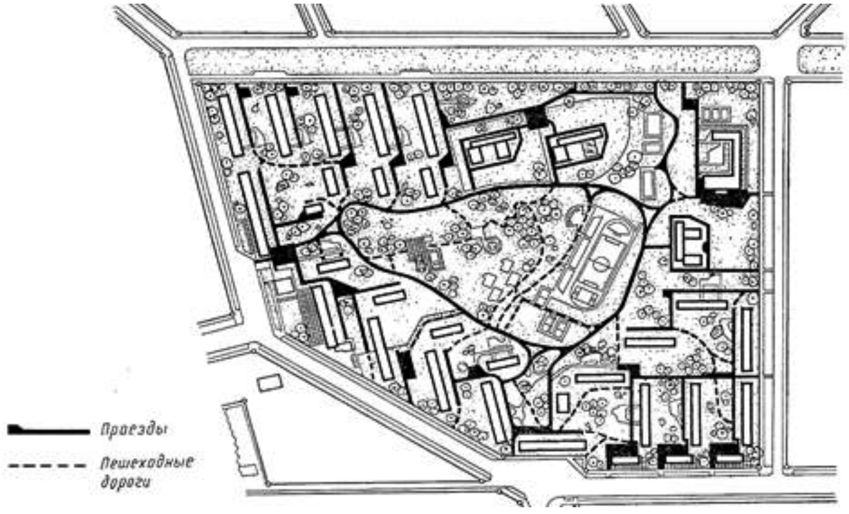 Рис. 5. План советского микрорайона с типовой застройкой, обобществленным пространством, локальным центром и магистральным автомобильным движением по периметру внешних границ. Городской образ жизни дезавуирован, застройка не предполагает уличной активности, весь жизненный сценарий сводится к замкнутому семейному быту