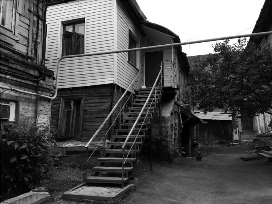 Рис. 8. Самара. Внутреннее пространство двора в историческом квартале. Двор выступает как промежуточное общественное пространство между домом и улицей. Именно во дворе происходят встречи соседей и решаются вопросы совместного будущего. В сущности, дом и двор представляют неразрывное целое и могут быть сведены к понятию уникальной типологии «дом-двор»