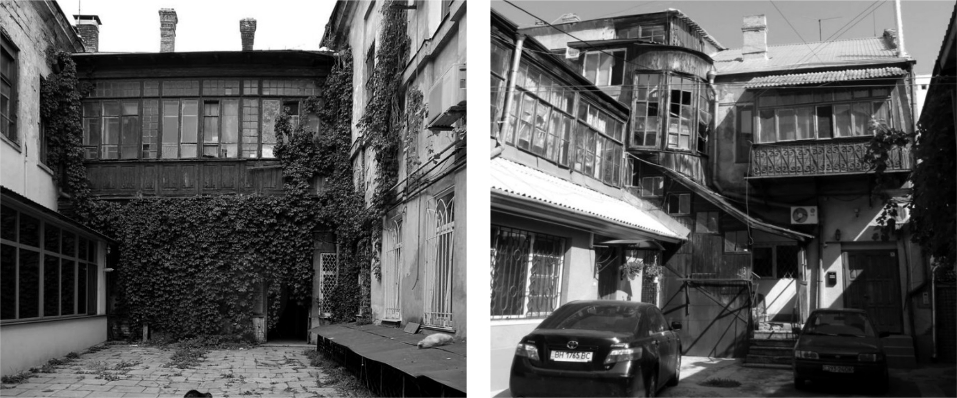 Рис. 10. Старые одесские дворы. Небольшая дистанция между противоположными сторонами двора позволяет сохранять чувство внутренней общности. Галереи, идущие по фасадам, создают дополнительное пространство приватности. Фактически двор напоминает городскую улицу или площадь, но целенаправленно ограничивает количественные параметры: размеры пространства , число и состав дворового сообщества