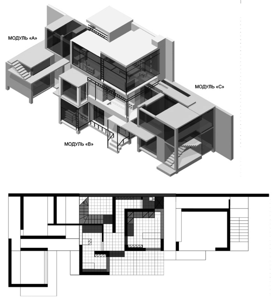 Рис. 14. «Дом-тетрис», экспериментальные разработки жилой типологии дома, вплотную примыкающего к границе парцеллы. Мастерская Малахова–Репиной, 2012 [10]