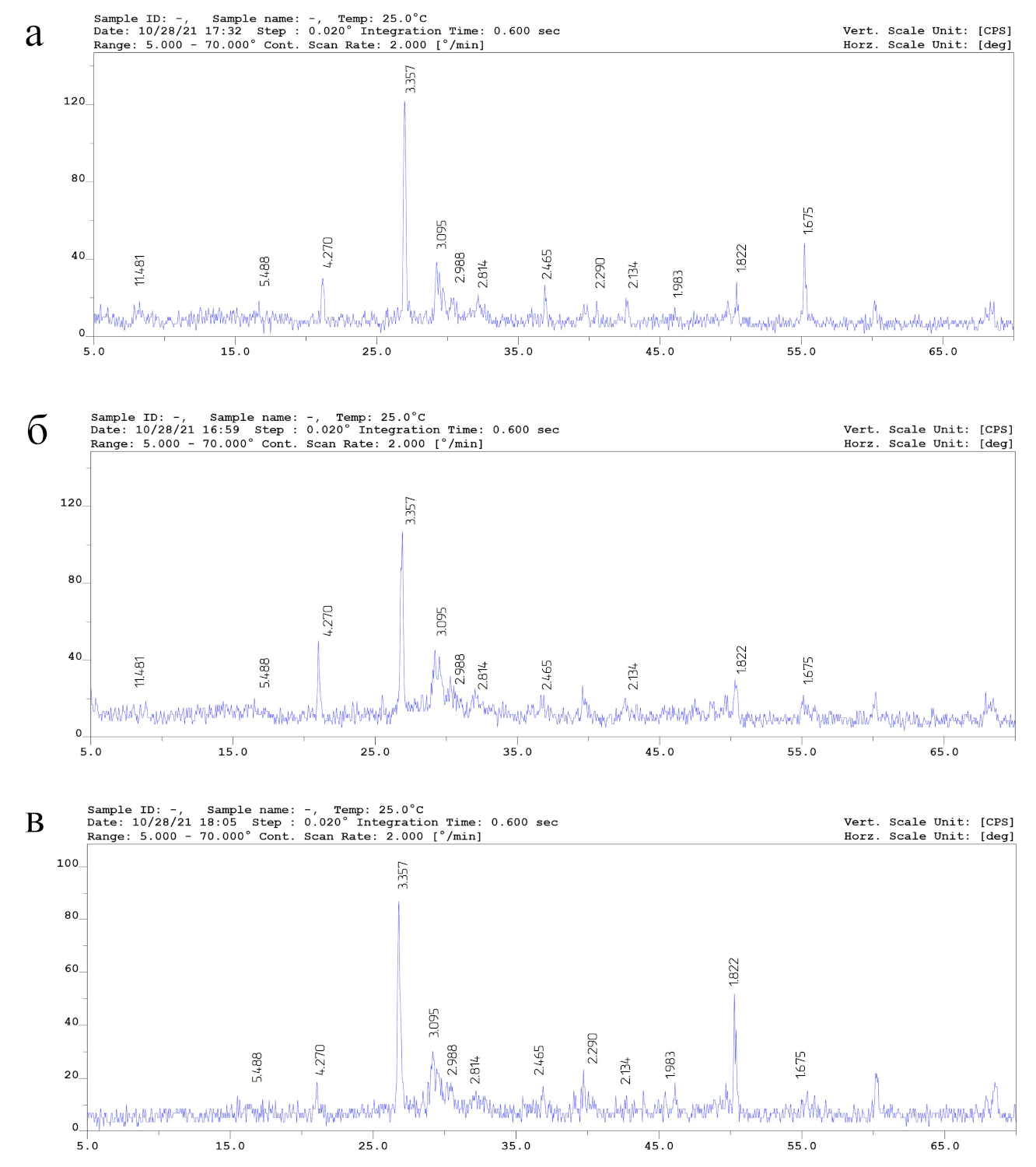 Рис. 2. Дифрактограмма образцов ячеистого бетона: а – образец I (с поверхности); б – образец II (с внутренней части); в – образец III (с нижней части)