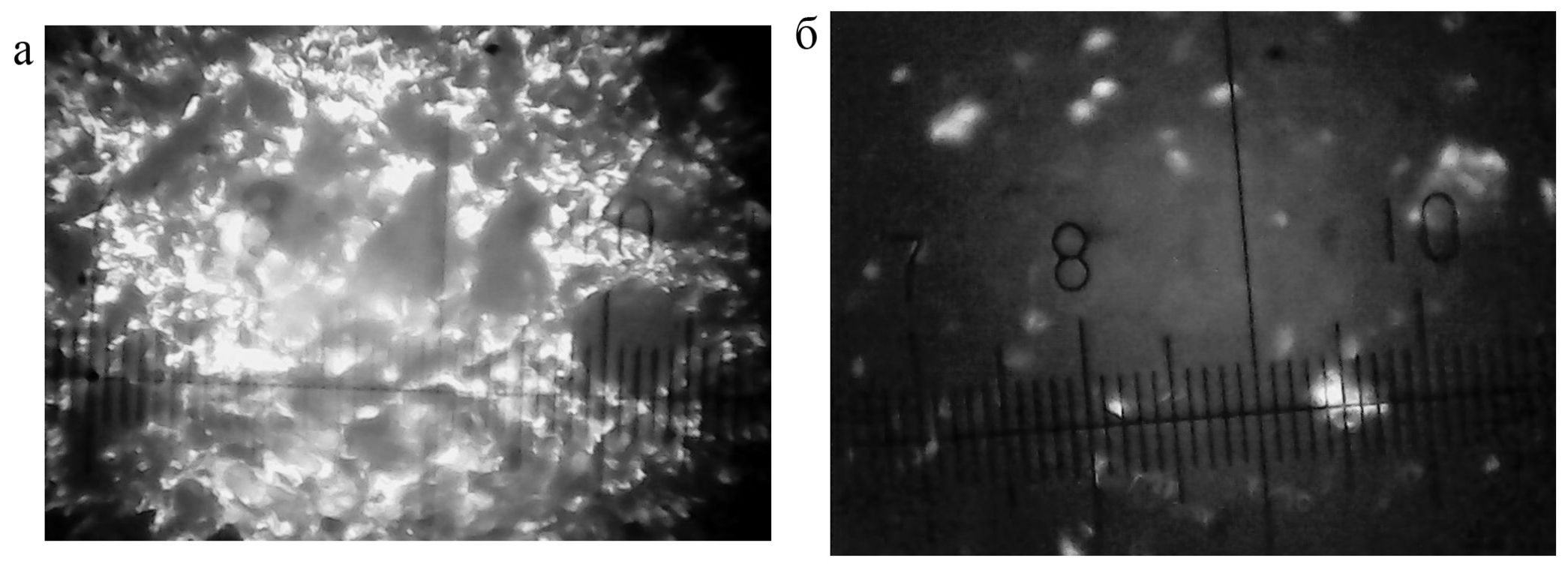 Рис. 3. Образец ячеистого бетона: а – в проходящем свете микроскопа; б – в скрещенных николях