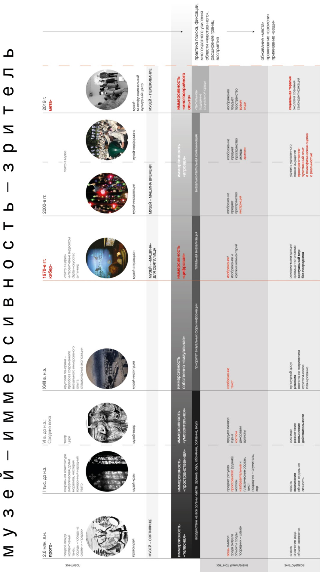Анализируя организацию пространства с помощью технологий иммерсивности, необходимо, по мнению О. Дерюгиной, разделить понятия «иммерсивность» и «интерактивность» (как один из инструментов, но не синоним), которые обычно идут в тесной связке: тогда можно рассматривать, как «интерфейс» (от помпейских фресок до новых медиа) воздействует на когнитивные механизмы (ощущение погружения, вовлечения/дистанцирования, контроля/дезориентации, наблюдения/обладания) и степень их проявления, на процессы чувствования и познавательную активность зрителя [1]. Специфика музейного пространства предполагает также подключение к аналитической базе исследования ключевых позиций музееведения: вышеобозначенный подход реализуется пионером теории музеальности З. Странским, который, вопреки общепринятым взглядам на музей как «новоевропейский феномен» (А. Мальро), обозначил особую онтологическую «музейную потребность» человеческой природы и предложил считать отправной точкой эволюции музейной среды палеолитическую эпоху [13]. Основу изучаемой типологии музеефицируемых сред составляют: предмузейные коллекции (Первобытное общество/ протомузей, Древний мир/протомузей-храм/ сокровищница, Средние века/протомузей-театр), музей как институт (Раннее Новое время/ храм науки и искусства/музей-лаборатория/ образовательный центр, Новое время/классический музей), музей-на-перепутьи (Новейшее время/музей-театр, музей без стен, виртуальный музей и т. д.) [14].
