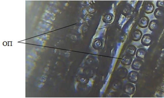Наличие однорядного расположения окаймленных пор (ОП) трахеид (рис. 3) свидетельствует о том, что исследуемый образец может быть отнесен к хвойным породам древесины − сосна или ель.