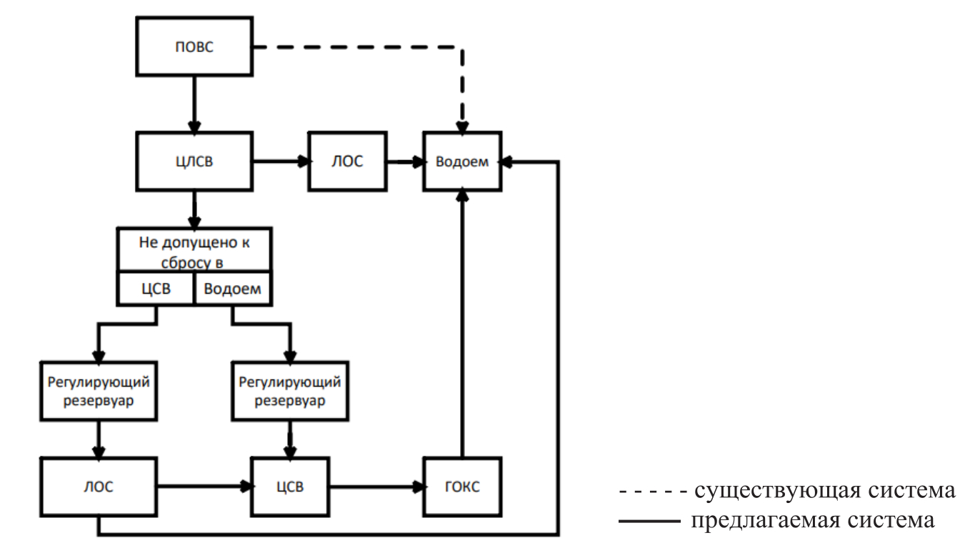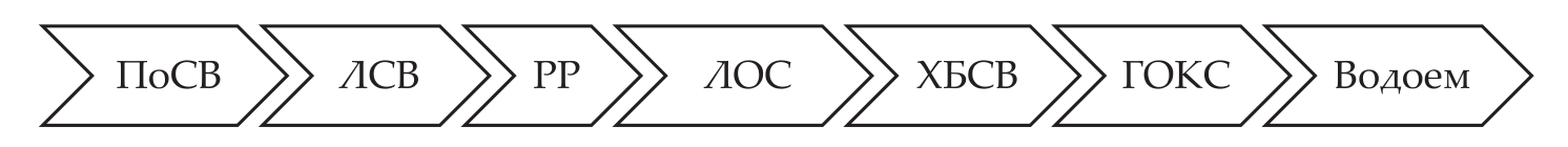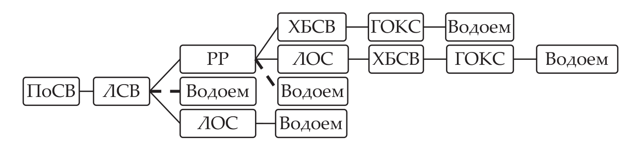 Рис. 6. Горизонтальная схема сброса ПоСВ: ЛСВ – ливневая сеть водоотведения; ЛОС – локальные очистные сооружения; ХБСВ – хозяйственно-бытовая сеть водоотведения; ГОКС – городские очистные канализационные сооружения