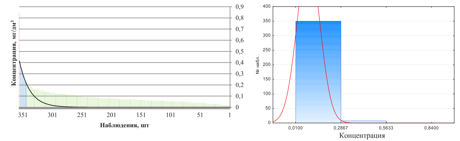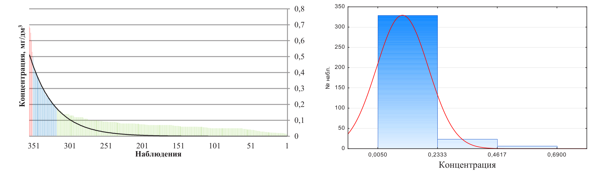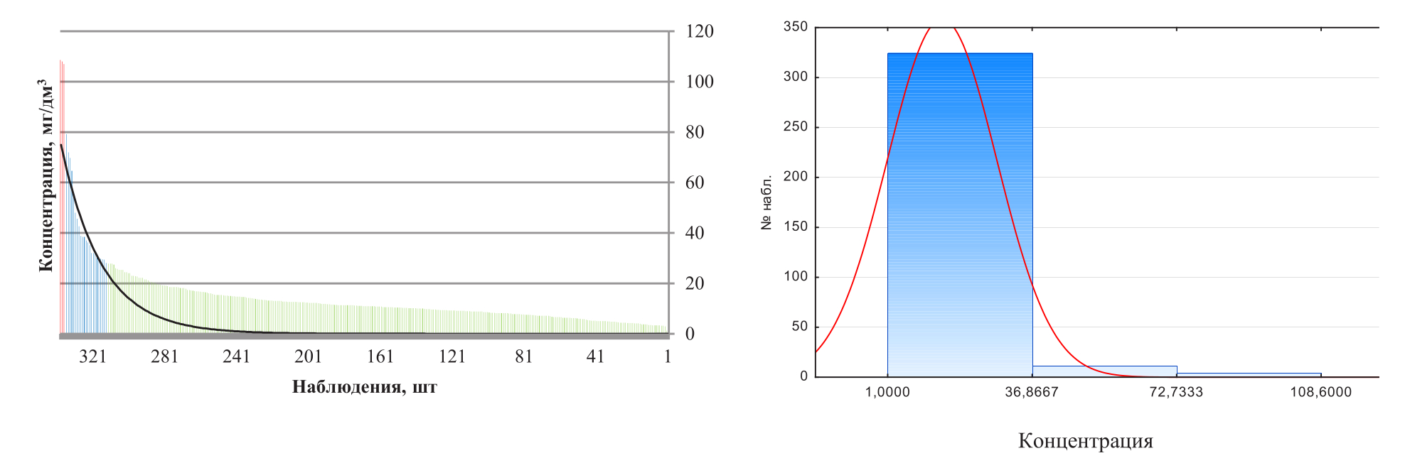 Исходя из табл. 3 были построены гистограммы (рис. 2 – 5), на которых показано нормальное распределение общего количества наблюдений (общего/суммарного количества химических анализов рассмотренного показателя) на три составные группы (максимальная, средняя, минимальная). По оси абсцисс отображены группы, а также их качественный диапазон, выраженный в мг/дм3, по оси ординат – количественный диапазон, выраженный в числах наблюдений.