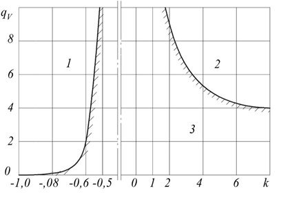Последние соотношения (12) и (13) получены из (10) при выполнении условия z2¯=1 в расширяющейся щели и z2¯=0 в сужающейся. На рис. 2 приведены границы однонаправленного течения в конусных щелевых зазорах, когда напорное течение совпадает с фрикционным. Чем больше конусность щели, тем меньше значение параметра qϑ при котором не изменяется направление потока. Границы однонаправленного потока (зона 1) асимптотически приближаются к значению k = –0,5 у сужающейся щели и k = 1 − у расширяющейся.