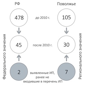 Рис. 1. Динамика изменения количества исторических поселений в Поволжье и РФ в целом