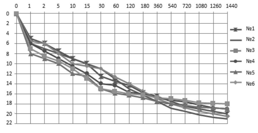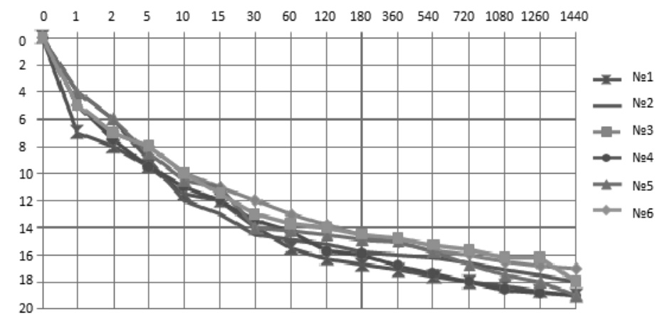 Рис. 2. Результаты серии экспериментов по проникновению керосина (объем 100 мл). По вертикали – глубина проникновения (см), по горизонтали – время наблюдения (мин)