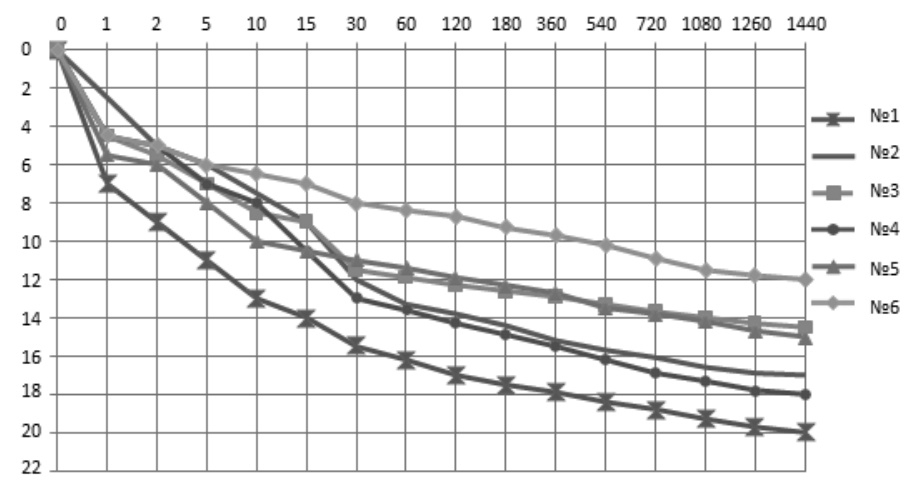 Рис. 4. Результаты серии экспериментов по проникновению дизельного топлива (объем 100 мл). По вертикали – глубина проникновения (см), по горизонтали – время наблюдения (мин)