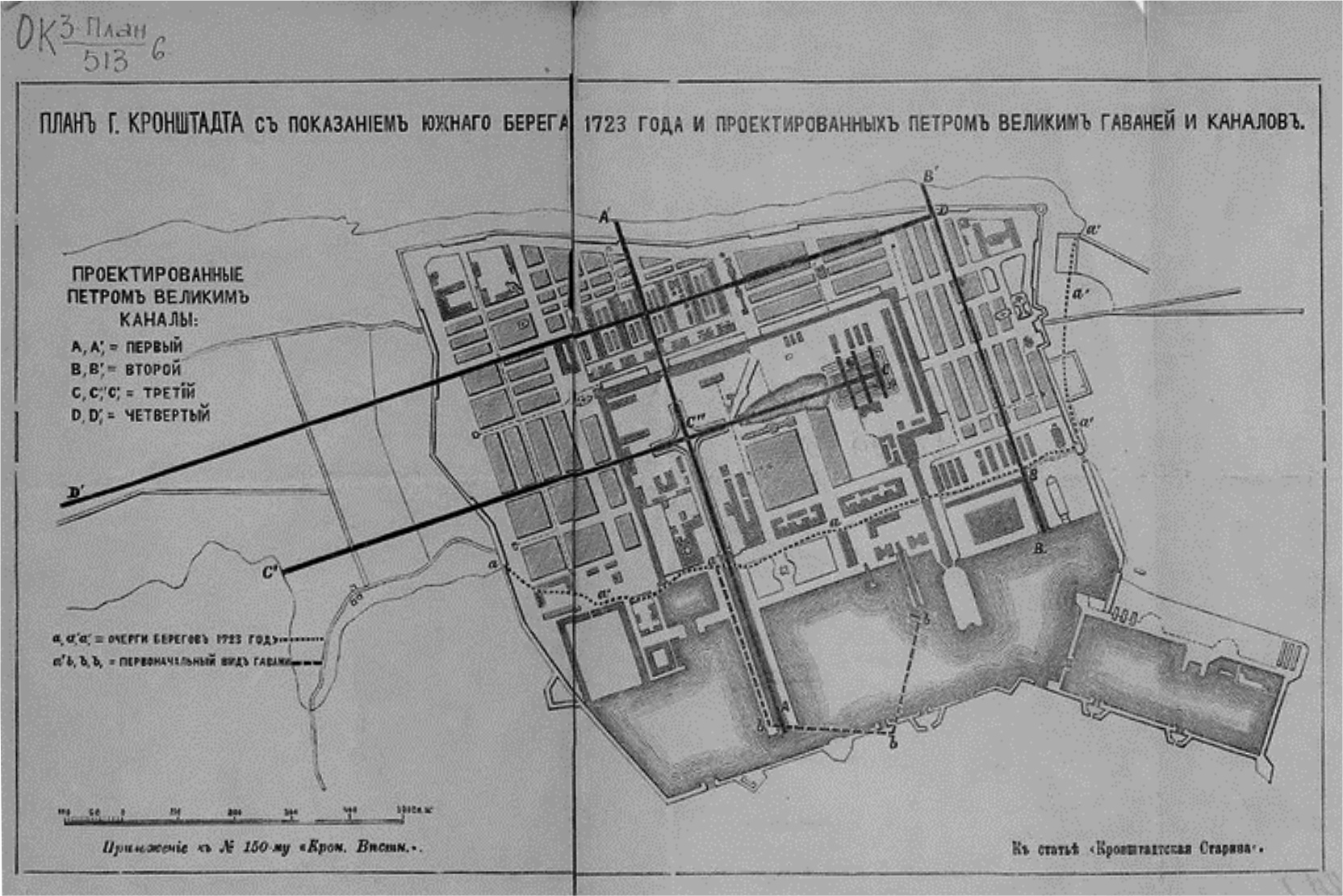 7 (18) октября 1723 г. на Петром I на острове Котлин была заложена крепость, получившая название Кронштадт, и только под защитой крепостных сооружений началось строительство города. По аналогии с Амстердамом, Петр планировал перерезать весь остров четырьмя каналами, из которых Первый – А, А должен был идти по направлению нынешнего канала Петра I и продолжаться до северного берега; Второй – В, В в том же направлении, должен был пересекать восточную часть острова; Третий – С, С, перпендикулярный двум первым, западным своим концом должен был соединяться с морем (севернее нынешней Цитадельской пристани), а к востоку доходить до оврага, на месте которого предполагалось вырыть огромный бассейн и в нем к югу и северу устроить по три эллинга; Четвертый канал – D, D, параллельный третьему, должен был идти в 220 саженях к северу от него и упираться западной своей оконечностью в море, а восточной во Второй канал – В, В, параллельный Первому и перпендикулярный к Третьему и Четвертому.