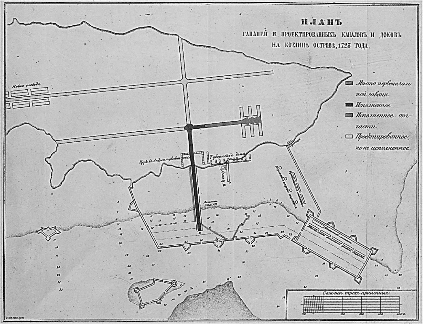 Надзор за строительными работами осуществлял сенатор М. М. Самарин [2]. В феврале 1718 г. Военная гавань, кроме западной её стенки, возвышалась над водой на 5 футов. На «Плане гаваней и проектированных каналов и доков на Котлине острове 1723 года» обозначено «место первоначальной гавани», а также очертания новых проектируемых и отчасти возведенных стенок новых гаваней (рис. 5).