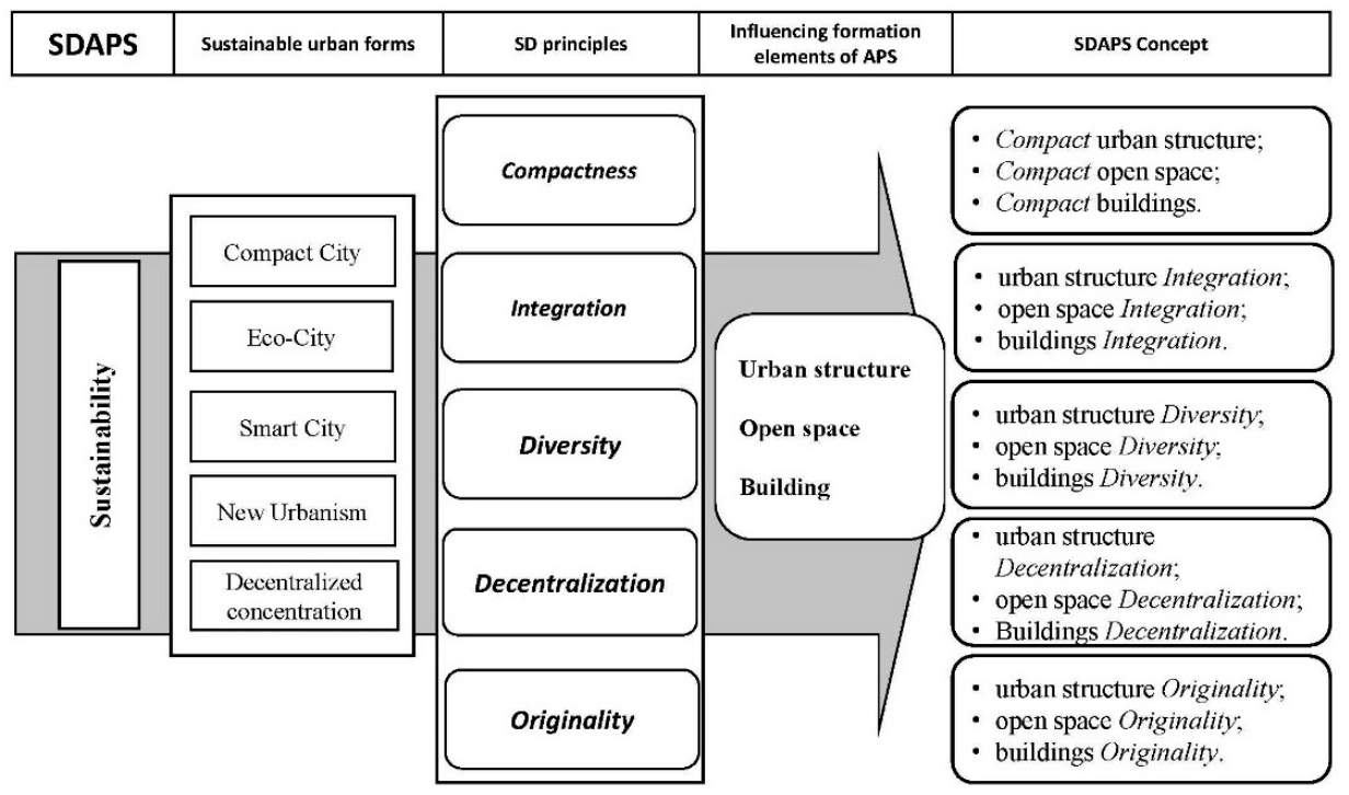 - recent sustainable development research includes forms (compact city, eco-city, new urbanism, smart city and decentralized concentration) and design principles (compactness, integration, diversity, decentralization and originality);