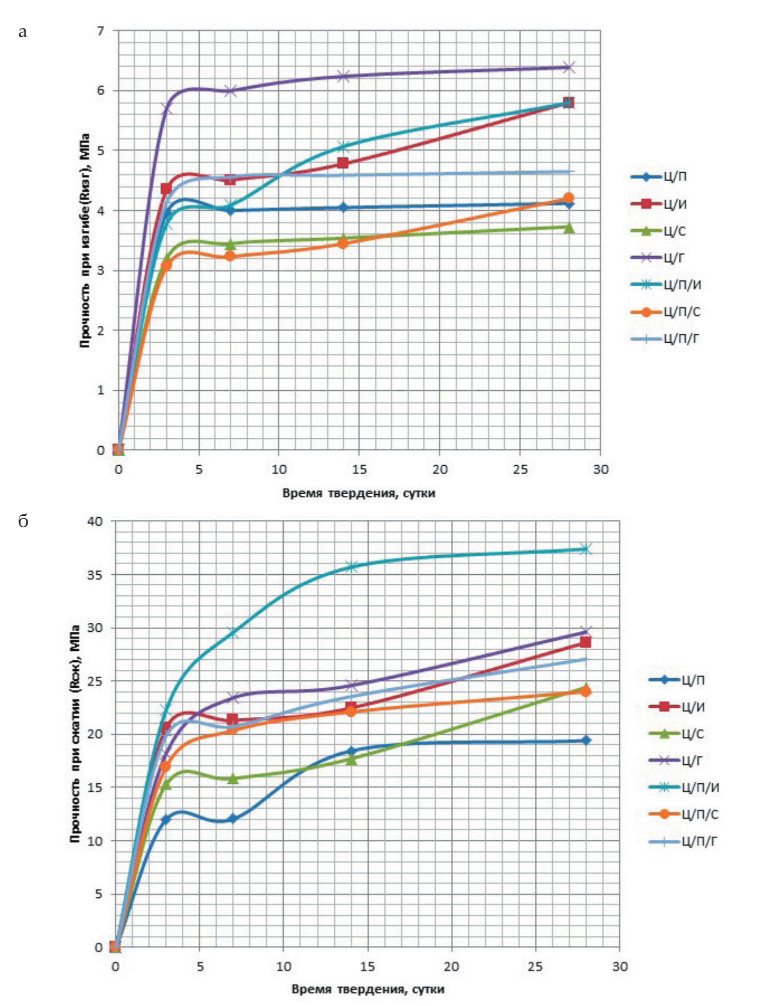 Рис. 3. Графики набора прочности образцов на изгиб (а) и сжатие (б)