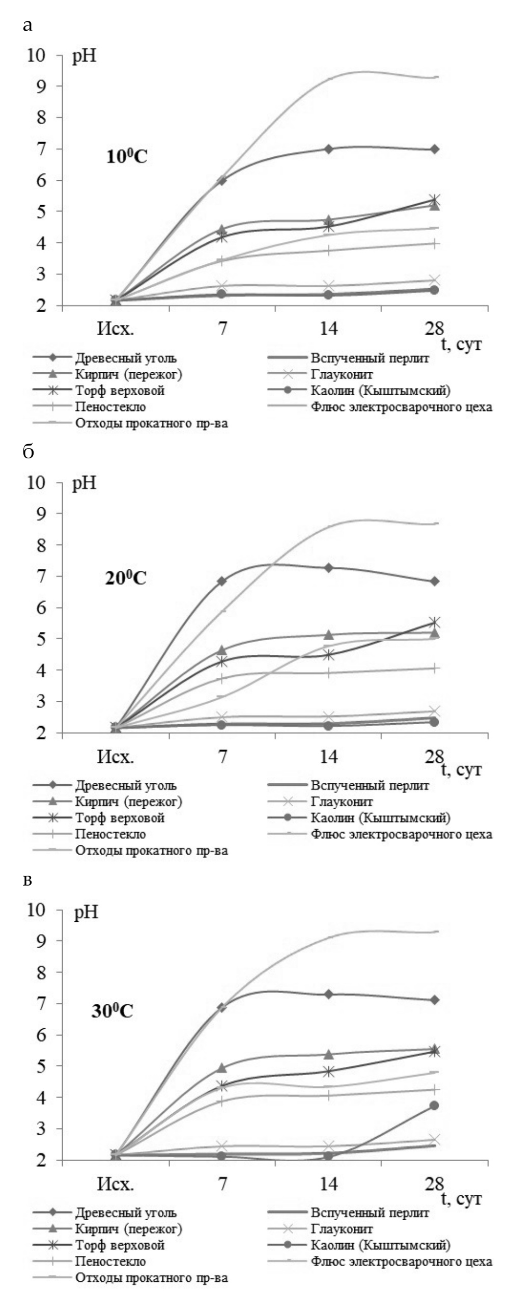 Данные на рисунках показывают, что при использовании в качестве сорбентов каолина, вспученного перлита, глауконита водородный показатель системы не изменяется и находится в сильно кислой области. Верховой торф, кирпич (пережог), пеностекло и отходы прокатного производства при взаимодействии со сточной водой в течение 7 сут повышают водородный показатель системы до 3,8–4,8. Вода после очистки имеет кислую и слабокислую реакцию. Древесный уголь и флюс электросварочного цеха одновременно с сорбцией тяжёлых металлов нейтрализуют сточную воду. Через 7 сут водородный показатель в этих системах имеет значение 6 при температуре 10 °С и увеличивается до 6,84 при температуре 30 °С, что соответствует нейтральной среде.
