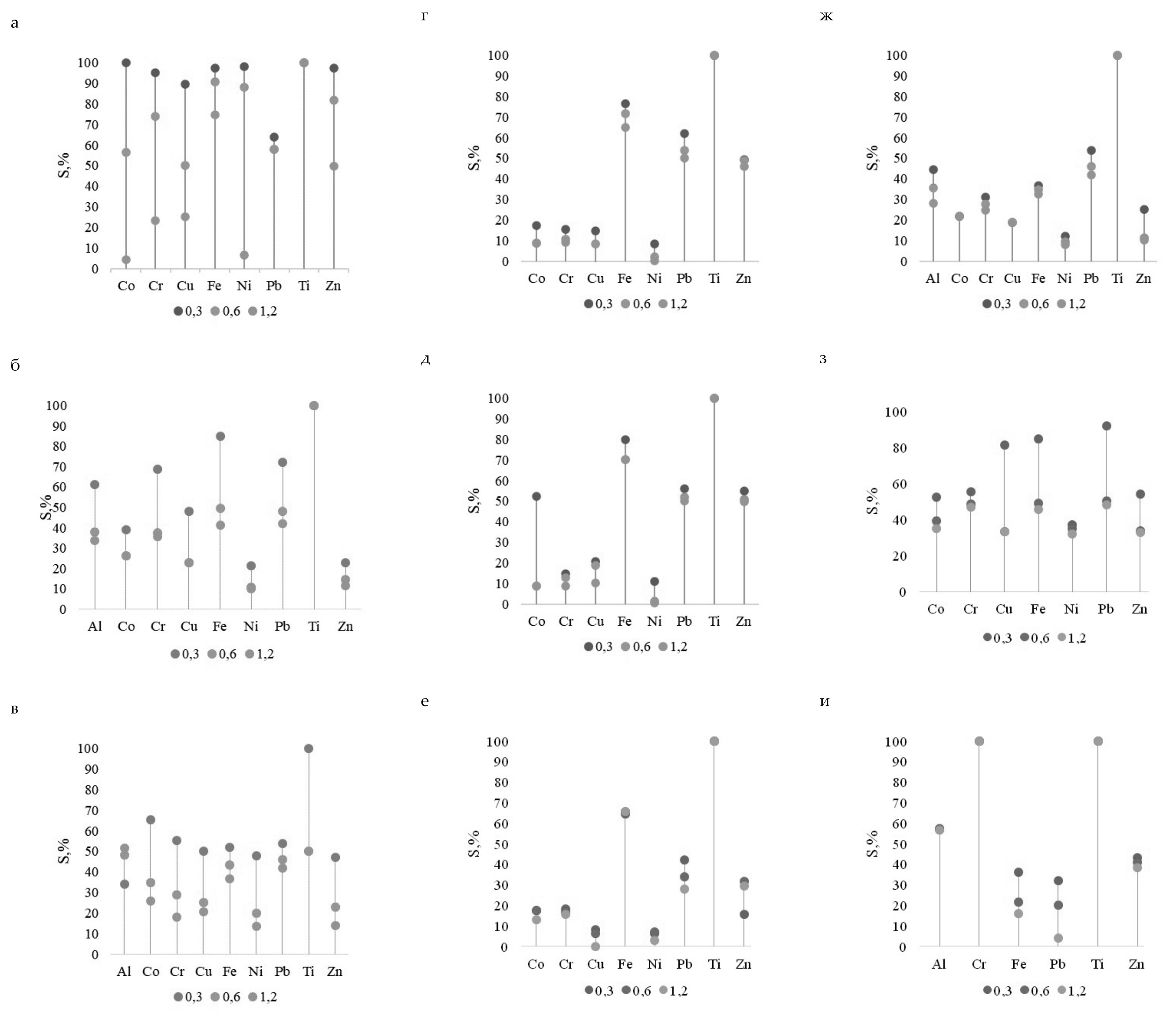 Рис. 2. Эффективность извлечения поллютантов из сточных вод при динамическом режиме фильтрации: а – торфом верховым; б – древесным углем; в – вспученным перлитом; г – кирпичом (пережог); д – глауконитом; е – каолином; ж – пеностеклом; з – флюсом электросварочного цеха; и – отходами прокатного производства