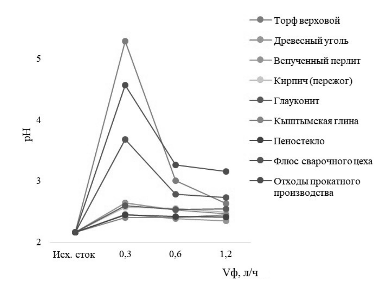Полученные данные показывают, что рН сорбата при использовании в качестве сорбента торфа верхового увеличивается с 2,16 до 5,28 при расходе фильтрата 0,3 л/ч, с увеличением расхода показатель снизился до 2,63 при 1,2 л/ч. Отходы прокатного производства и флюс электросварочного цеха увеличивают рН сорбата после взаимодействия до 4,6 и 3,7 при низких расходах фильтрата. Пеностекло, глина, глауконит, вспученный перлит и древесный уголь практически не изменяют водородный показатель фильтрата, он остаётся в сильнокислой области.