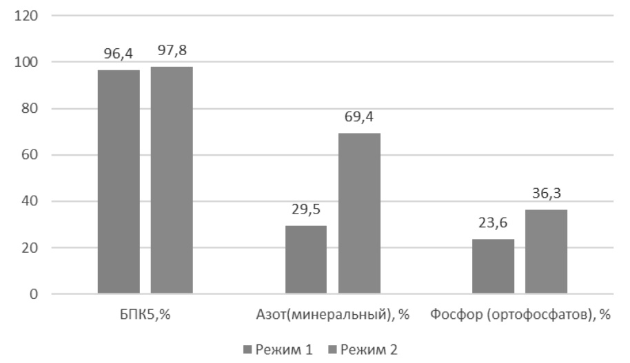 Данное исследование нацелено на изучение работы циркуляционного окислительного канала с зонированными кислородными макрозонами, расположенными по длине установки. Было изучено два технологических режима работы установки, отличающихся кислородными условиями работы и степенью внутренней рециркуляции. Наличие аэробной зоны повысило стабильность системы, нитчатого вспухания обнаружено не было. В целом лабораторный реактор показал достаточную эффективность при очистке сточных вод от органических соединений и азота. Эффективность очистки представлена на рис. 2.