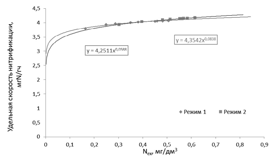 Рис. 4. Зависимости удельных скоростей нитрификации от остаточных концентраций азота аммонийного в очищенной сточной воде