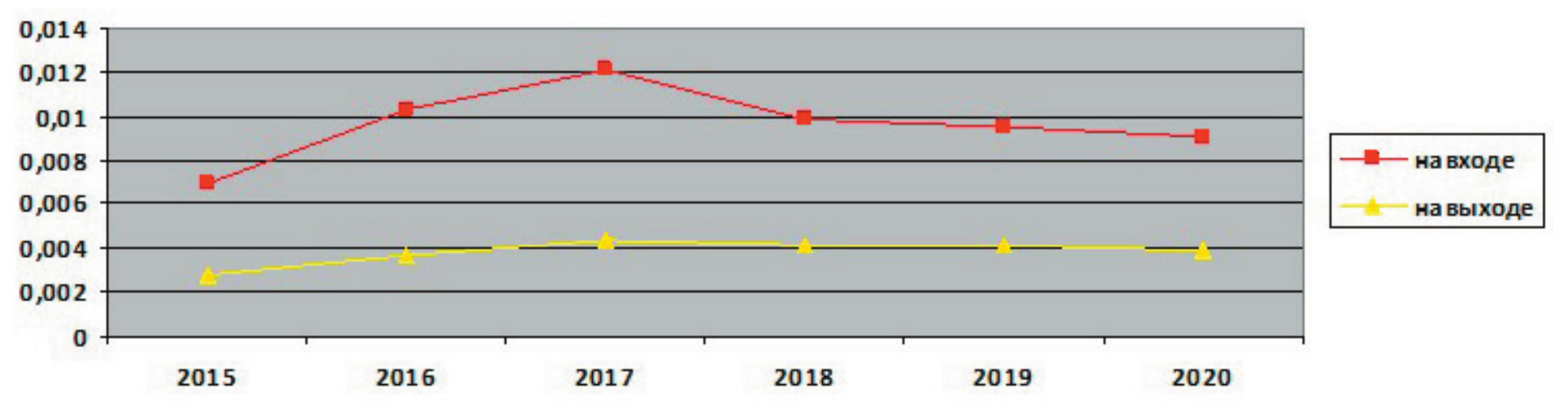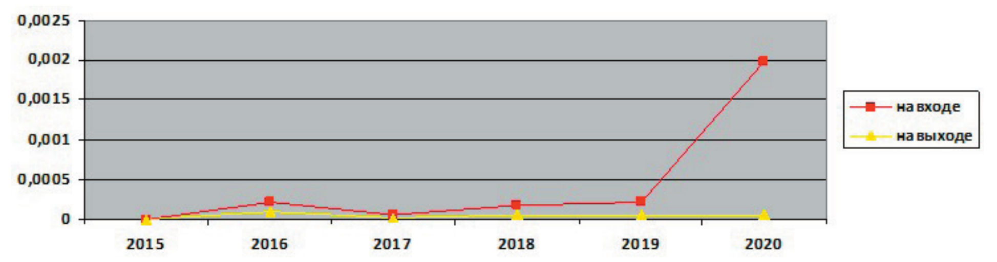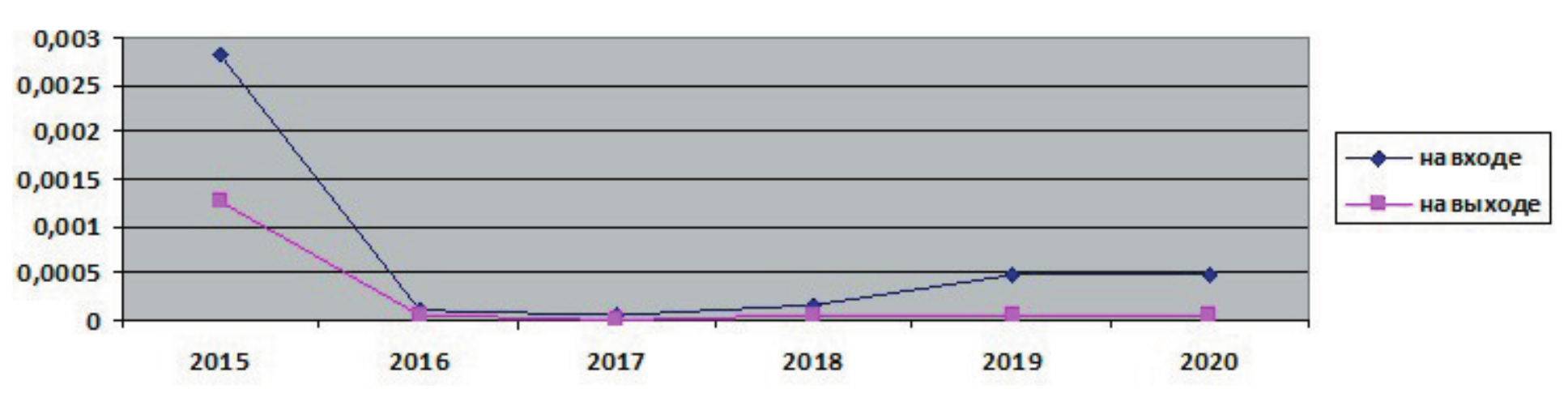 На рис. 2 показан график измерения концентрации бензола. Первый отбор проб был выполнен 31 мая 2015 г. Температура газа на входе в аппарат составляла 73 ℃, после очистки – 53 ℃. Расход воды на орошение внутри установки составил 4,5 м3/ч. Концентрация бензола до очистки составляла 0,002813 г/м3, после наблюдалось снижение концентрации бензола в воздухе до 0,00127 г/м3, однако полученные результаты при сопоставлении к ПДК оказались завышены. Результаты исследования проб газа (воздуха) и сопоставления к ПДК представлены в табл. 2. По результатам исследований в 2015 г. был получен показатель эффективности по очистке газа от примесей бензола – 54,85 %. Второй отбор проб был выполнен 29 сентября 2016 г. Температура газа на входе в аппарат составляла 100 ℃, после очистки – 48 ℃. Расход воды на орошение внутри установки составил 8,0 м3/ч. Концентрация бензола до очистки составляла 0,000117 г/м3, после наблюдалось снижение концентрации бензола в воздухе до 0,000065 г/м3. По результатам исследований в 2016 г. был получен показатель эффективности по очистке газа от примесей бензола – 44,44 %. Третий отбор проб был выполнен 23 мая 2017 г. Температура газа на входе в аппарат составляла 100 ℃, после очистки – 56 ℃. Расход воды на орошение внутри установки составил 8,0 м3/ч. Концентрация бензола до очистки составляла 0,000047 г/м3, после наблюдалось снижение концентрации бензола в воздухе до 0,000002 г/м3. По результатам исследований в 2017 г. был получен показатель эффективности по очистке газа от примесей бензола – 95,74 %. Четвертый отбор проб был выполнен 11 мая 2018 г. Температура газа на входе в аппарат составляла 100 ℃, после очистки – 52 ℃. Расход воды на орошение внутри установки составил 8,0 м3/ч. Концентрация бензола до очистки составляла 0,000153 г/м3, после наблюдалось снижение концентрации бензола в воздухе до 0,00005 г/м3. По результатам исследований в 2018 г. был получен показатель эффективности по очистке газа от примесей бензола – 67,32 %. Пятый отбор проб был выполнен 5 мая 2019 г. Температура газа на входе в аппарат составляла 101 ℃, после очистки – 53 ℃. Расход воды на орошение внутри установки составил 8,0 м3/ч. Концентрация бензола до очистки составляла 0,00049 г/м3, после наблюдалось снижение концентрации бензола в воздухе до 0,000053 г/м3. По результатам исследований в 2019 г. был получен показатель эффективности по очистке газа от примесей бензола, равный 89,18 %. Шестой отбор проб был выполнен 7 мая 2020 г. Температура газа на входе в аппарат составляла 100 ℃, после очистки – 54 ℃. Расход воды на орошение внутри установки составил 8,0 м3/ч. Концентрация бензола до очистки составляла 0,00048 г/м3, после наблюдалось снижение концентрации бензола в воздухе до 0,000052 г/м3. По результатам исследований в 2020 г. был получен показатель эффективности по очистке газа от примесей бензола – 89,16 %.