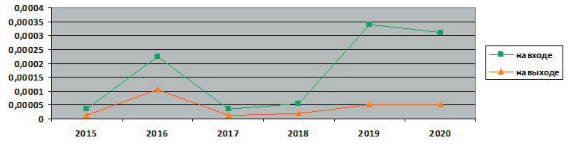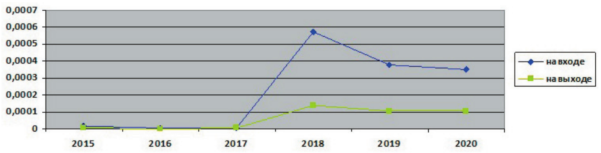 На рис. 5 показан график измерения концентрации этиленбензола. Первый отбор проб был выполнен 31 мая 2015 г. Температура газа на входе в аппарат составляла 73 ℃, после очистки – 53 ℃. Расход воды на орошение внутри установки составил 4,5 м3/ч. Концентрация этиленбензола до очистки составляла 0,000018 г/м3, после наблюдалось снижение концентрации этиленбензола в воздухе до 0,000008 г/м3. Результаты исследования проб газа (воздуха) и сопоставления к ПДК представлены в табл. 2. По результатам исследований в 2015 г. был получен показатель эффективности по очистке газа от примесей этиленбензола – 55,55 %. Второй отбор проб был выполнен 29 сентября 2016 г. Температура газа на входе в аппарат составляла 100 ℃, после очистки – 48 ℃. Расход воды на орошение внутри установки составил 8,0 м3/ч. Концентрация этиленбензола до очистки составляла 0,000003 г/м3, после наблюдалось снижение концентрации этиленбензола в воздухе до 0,0000001 г/м3. По результатам исследований в 2016 г. был получен показатель эффективности по очистке газа от примесей этиленбензола – 96,66 %. Третий отбор проб был выполнен 23 мая 2017 г. Температура газа на входе в аппарат – 100 ℃, после очистки – 56 ℃. Расход воды на орошение внутри установки составил 8,0 м3/ч. Концентрация этиленбензола до очистки составляла 0,000006 г/м3, после наблюдалось снижение концентрации этиленбензола в воздухе до 0,000003 г/м3. По результатам исследований в 2017 г. был получен показатель эффективности по очистке газа от примесей этиленбензола – 50,0 %. Четвертый отбор проб был выполнен 11 мая 2018 г. Температура газа на входе в аппарат – 100 ℃, после очистки – 52 ℃. Расход воды на орошение внутри установки составил 8,0 м3/ч. Концентрация этиленбензола до очистки составляла 0,000573 г/м3, после наблюдалось снижение концентрации этиленбензола в воздухе до 0,00014 г/м3. По результатам исследований в 2018 г. был получен показатель эффективности по очистке газа от примесей этиленбензола – 75,56 %. Пятый отбор проб был выполнен 5 мая 2019 г. Температура газа на входе в аппарат составляла 101 ℃, после очистки – 53 ℃. Расход воды на орошение внутри установки составил 8,0 м3/ч. Концентрация этиленбензола до очистки составляла 0,00038 г/м3, после наблюдалось снижение концентрации этиленбензола в воздухе до 0,000106 г/м3. По результатам исследований в 2019 г. был получен показатель эффективности по очистке газа от примесей этиленбензола – 72,10 %. Шестой отбор проб был выполнен 7 мая 2020 г. Температура газа на входе в аппарат составляла 100 ℃, после очистки – 54 ℃. Расход воды на орошение внутри установки составил 8,0 м3/ч. Концентрация этиленбензола до очистки составляла 0,00035 г/м3, после наблюдалось снижение концентрации этиленбензола в воздухе до 0,000103 г/м3. По результатам исследований в 2020 г. был получен показатель эффективности по очистке газа от примесей этиленбензола – 70,57 %.
