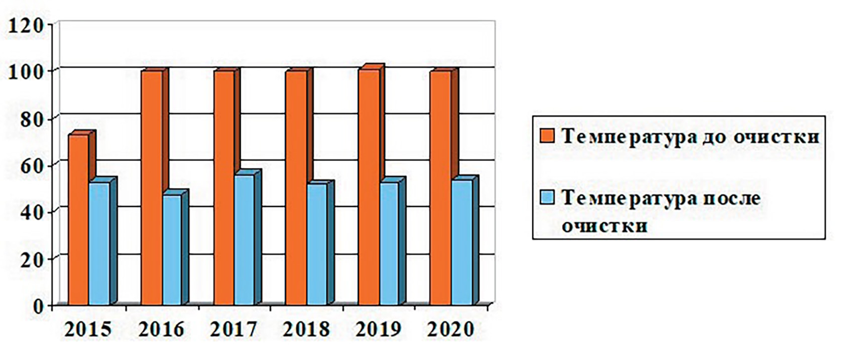 По результатам полученных данных о температуре газовоздушной смеси при поступлении ее на очистку и после установлено, что в процессе очистки воздуха температура газа снижается в два раза. Снижение температуры относительно исходных показателей представлено на рис. 7. Однако несмотря на значительное уменьшение температуры после очистки, наблюдается увеличение температуры атмосферного воздуха выше естественного уровня, что является тепловым загрязнением окружающей среды. Выброс в атмосферу происходит на высоте менее трех метров, что препятствует рассеиванию загрязняющих веществ и является опасным для человека.