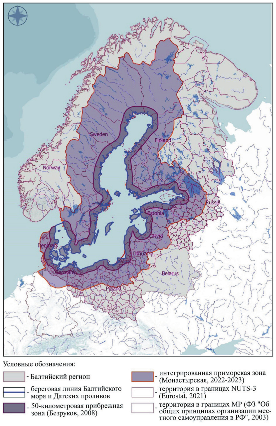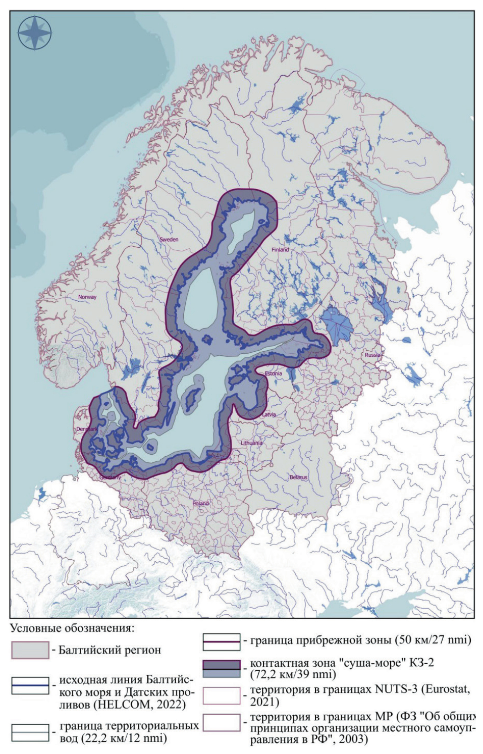 Таким образом, по Децу, главным индикатором принадлежности территорий к приакваториальным объектам, согласно методике Евростата, становится их население [22, с. 19] и административный статус. Номенклатурно-географические образования третьего уровня «в каждой стране ЕС (названия и даже сами средние площади таких <…> образований отличаются друг от друга) были включены в ряд» [22, с. 19] «прибрежных регионов» «при соблюдении следующего условия: более половины населения территории должны проживать не далее 50 км от побережья» [там же]. К категории «прибрежных регионов» были формально причислены «крупные по площади административно-территориальные образования севера Финляндии и Швеции, <…> континентальные части которых располагаются более чем в 250 км от морских побережий, но население которых преимущественно проживает в приморской зоне» [22, с. 19]. К таким NUTS 3 относятся малонаселенные шведские лёны Вестерботтен с административным центром Умео (площадь 54 672 км2, плотность населения 4,7 чел./км2) и Норрботтен с административным центром Лулео (площадь 97 257 км2, плотность населения 2,5 чел./км2), а также финские провинции Лапландия с административным центром Рованиеми (площадь 92 660 км2, плотность населения 2,0 чел./км2) и Северная Остроботния с адмистративным центром Оулу (площадь 35 508 км2, плотность населения 11,5 чел./км2). С другой стороны, значительно уступающие перечисленным «прибрежным регионам» по площади, но намного более плотно заселенные NUTS 3 Германии (земельные районы), Литвы (уезды), Латвии (статистические районы), Польши (подрегионы), Эстонии (мааконды), МР Калининградской и Ленинградской областей, а также город федерального значения Санкт-Петербург практически полностью входят в границы маркировочной 50-километровой полосы, что прямо указывает на избыточную формализацию территориально-делимитационной методики Евростата в отношении определения границ «зон притяжения» моря (рис. 3). Порядок же выявления «прибрежных зон», принятый Евростатом и базирующийся на концепте «территориализации» [9, 17] может, тем не менее, представлять значительный интерес, в том числе при решении вопросов территориально-акваториального толка в процессе «конструирования» «контактной структуры» [14] «суша-море».