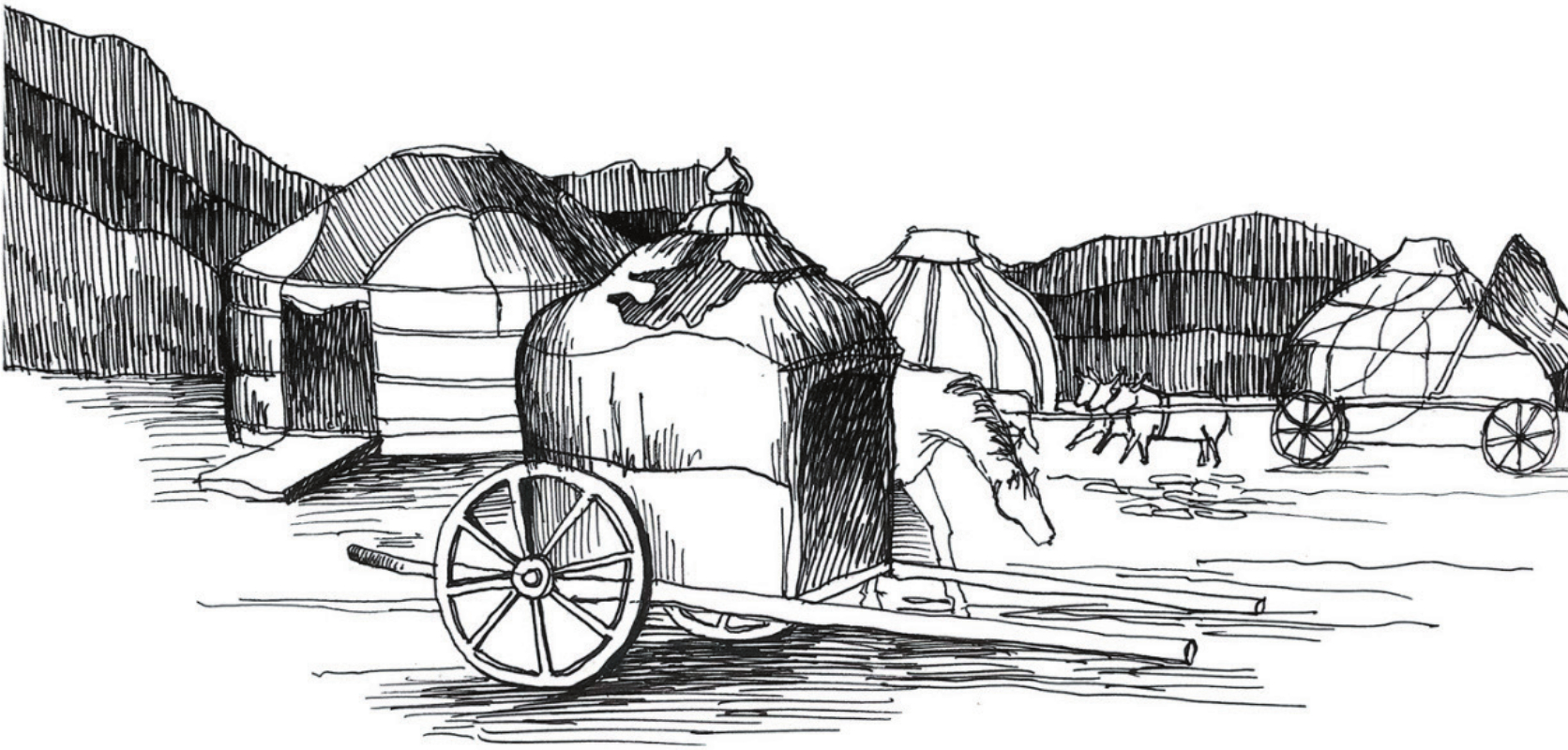 Дом на колесах, еще один вид мобильного жилища кочевых народов, был распространен у монголов в XI–XII вв. Это были телеги-кибитки (см. рис. 1), необходимые для быстрого перемещения с места на место из-за многочисленных нападений и набегов. В XIII в. функция кибиток изменилась – они использовались в дальних походах для перегона стада на новые пастбища [8].