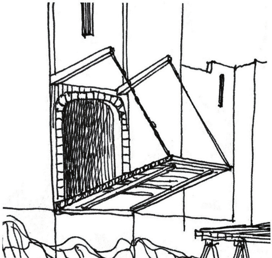 Первые простейшие механизмы появились в Средние века, которые позволили статичному архитектурному объекту приобрести первые свойства трансформации. Это были раздвижные или подъемные мосты (рис. 4). Многие средневековые замки окружались глубокими рвами от врагов, подступить к замку можно было только через такой подъемный мост, закрепленный канатами или цепями у внешней части стены крепости. В вертикальном положении мост закрывал собой ворота и приводился в движение с помощью механизмов, устроенных внутри стены крепости. Такие сооружения имели оборонительную функцию.