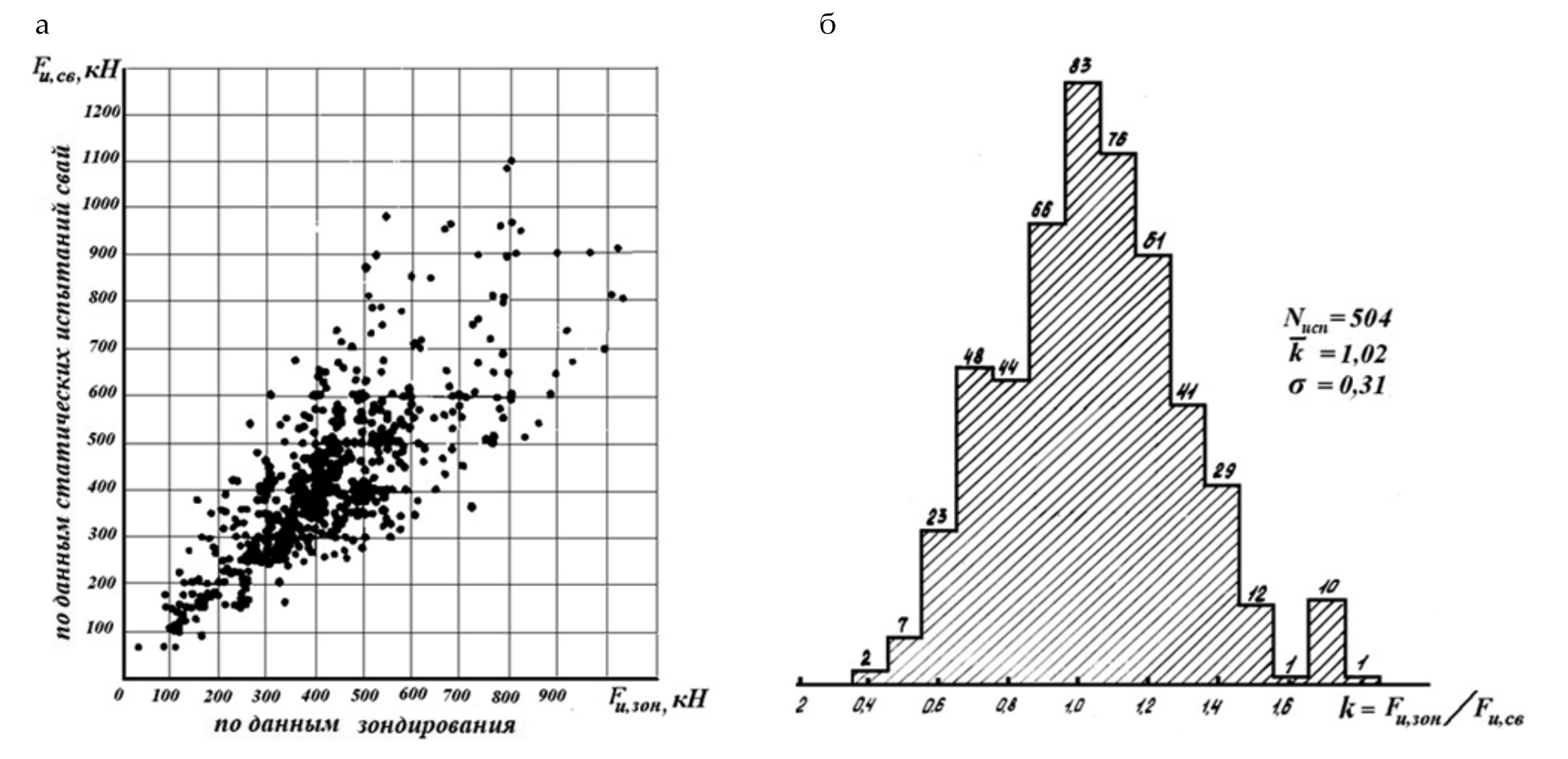 Рис. 1. Результаты сопоставления предельных сопротивлений забивных призматических свай, рассчитанных по данным зондирования, Fu,зон, с сопротивлениями, полученными путем их статических испытаний, Fu,св: а – диаграмма рассеяния «Fu,св ~ Fu,зон»; б – гистограмма распределения отношений Fu,зон / Fu,зон, построенная по тем же данным