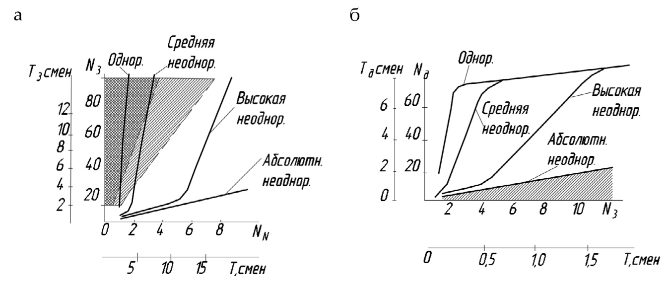 Рис. 3. Линии «эквивалентных» по своей информативности количеств испытаний грунтов разной достоверности (т. е. вносящих одинаковое количество информации о сопротивлениях свай): а – сравнение статического зондирования с испытаниями свай статической нагрузкой; б – то же с динамическими испытаниями свай; Nз, Nи, Nд – числа испытаний соответственно зондированием, статическими нагрузками, динамическими испытаниями; Тз, Ти, Тд ‒ продолжительность комплекса испытаний соответственно зондированием, статической нагрузкой, динамическими испытаниями