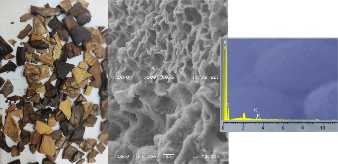 Fig. 1. Walnut shell (carbonized) micrographs and microrentgenospectral analysis data
