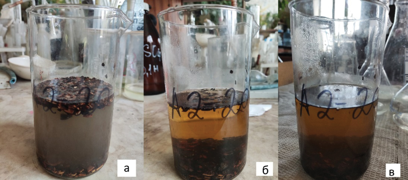 На рис. 2 представлены фотографии системы сорбент – сорбат при проведении эксперимента в статических условиях. Отчётливо видно, что цвет сорбата при контакте с сорбентом изменяется, снижается мутность раствора. В процессе очистки наблюдалось изменение цветности сточной воды, что вызвано наличием в скорлупе грецкого ореха дубильных веществ, пигмента (органическое соединение – юглон), и его переход из сорбента в сточную воду.